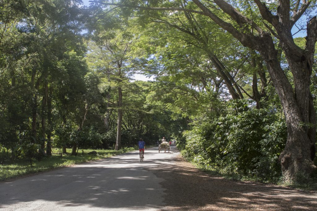 Die Fahrt geht weiter. Vorbei an Reisfeldern, Ylang-Ylang-Plantagen mit den typischen knorrigen, fast „falschrum“ wachsenden niedrigen Bäumchen geht es bis zu einer Abzweigung, die uns Richtung Ambilobe führt. Zwei Ferkel überqueren irgendwo im Nirgendwo plötzlich die Straße. Die Landschaft ist grün, doch auf den Hügeln sieht man immer wieder kahle Stellen, wo die rote Erde Madagaskars hervorlugt. Alles hier ist Sekundärvegetation, wenn sie auch gerade sehr üppig aussieht. Unmengen Ravenalas säumen die Straße. Hier und da kommt uns ein klappriger Renault R4 entgegen. Hoch beladene Taxibrousse weichen den immer mehr werdenden Schlaglöchern aus. Auf einem türmen sich zehn Schaumstoffmatratzen hinter einem Haufen Fahrräder und Autoreifen. Wie der Fahrer den altersschwachen Bus überhaupt gelenkt bekommt, ist mir ein Rätsel. Aber auch Privatautos stehen der Beladung von Taxibrousses hier in Nichts nach: Ein Ford kommt uns mit einem ganzen Hausstand beladen entgegen. Als wir Beramanja passieren, klart der Himmel langsam auf. Die Wolken verziehen sich, die Sonne kommt hervor. Die Landschaft wird wieder etwas mehr savannenartig.
