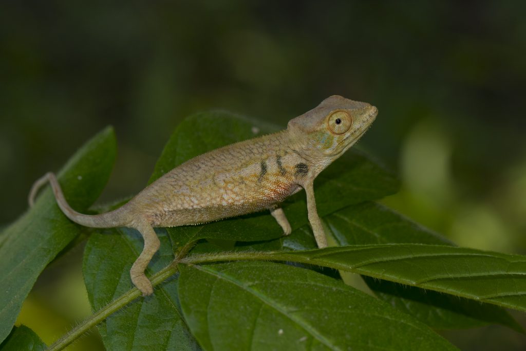 Die kleine Auto-Karawane setzt sich in Richtung Ambanja in Bewegung. Bereits kurz hinter Ankify halten wir an einem Bambuswäldchen. Stefan und Steffi wollen hier nach Phelsuma klemmeri suchen, und ich bin sehr gespannt, ob wir die farbenfrohen Geckos entdecken werden. Ich schlendere gemütlich in Flip-Flops die Straße entlang und dann einen kiesigen, mit Gras bewachsenen Weg nach oben. In den Bambushain hinein gehe ich nicht, das ist mir mit den vielen abgebrochenen, messerscharfen Bambusstümpfen zu gefährlich. Der Bambushain ist klein, aber sehr hoch und dicht – wie soll man hier einen winzigen Gecko finden? Aber die beiden Phelsumenfreaks haben Glück: Steffi entdeckt tatsächlich Phelsuma klemmeri, allerdings wie schon auf dem Hinweg nicht auf einem Bambus, sondern auf einem stinknormalen Baum. Wenige Meter davon klettert gerade ein ausgewachsenes Pantherchamäleon-Männchen im niedrigen Gebüsch. Er versucht gerade, auf den Boden zu kommen, und läuft dann flugs über den Weg auf die andere Seite, um dort in einen Baum zu klettern. In den Bäumen lassen sich noch andere Taggeckos finden, darunter die hübschen Phelsuma seippi und ebenso hübsche Phelsuma grandis. So richtig viel los ist aber geckotechnisch nicht, das Wetter ist auch ungünstig. Dicke, graue Wolken bedecken den Himmel, es ist drückend schwül.