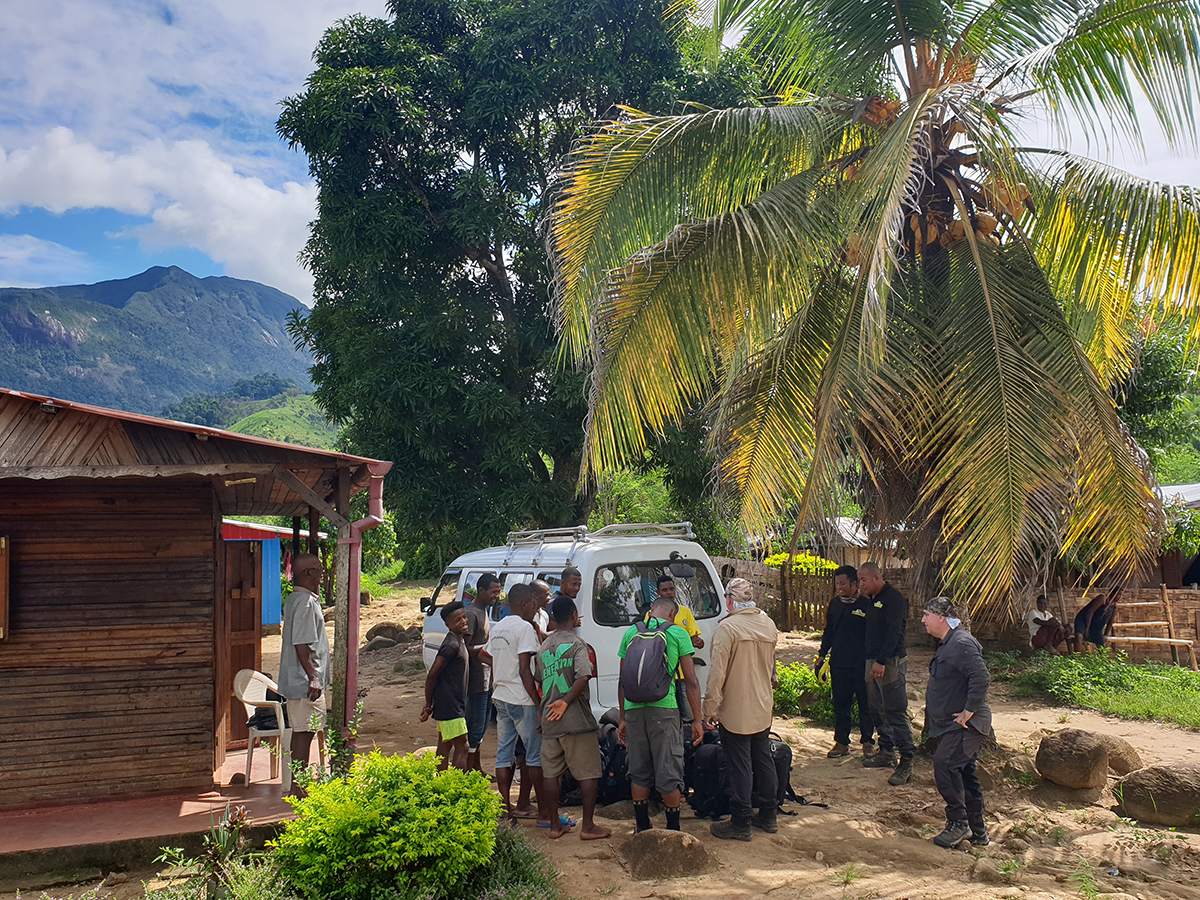 In Mandena parkt Bruno auf einer Kreuzung unter großen Bäumen. Holzhütten stehen drumherum. Die Gruppe von Trägern wartet bereits auf uns. Mit Coco, der die Zuteilung der Rucksackträger übernimmt. Mein Rucksackträger heißt Elioda. Er ist sehr klein und sehr schmal. Und die Fotorucksäcke sind offenbar alle schwerer als gedacht. Ich helfe Elioda beim Anpassen der Rucksackgurte. Der Hüftgurt, der bei mir seitlich auf der Hüfte liegt, stößt bei ihm in der Mitte zusammen und trotzdem ist noch Platz darunter. Lassen wir das einfach mal so stehen.
