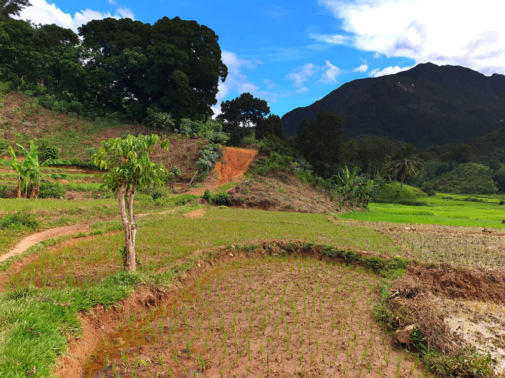 Und dann laufen wir. Coco geht vor. Er führt uns auf einen schmalen Lateritweg, der an unendlich vielen, leuchtend grünen Reisfeldern entlang führt. Es ist unglaublich warm und feucht, trotz der frühen Tageszeit und des bedeckten Himmels. Ich quere größere und kleinere Brücken. Hier und da spendet ein Mangobaum mal Schatten. Bereits bei der ersten Pause sind alle nassgeschwitzt. Die ersten Träger kommen bereits angelaufen, sie haben uns schon eingeholt. Wir folgen dem Pfad zwischen Hügeln hindurch immer weiter und weiter. Am Fluss geht Coco mit zwei Rucksackträgern vor und weist den Weg von Stein zu Stein. Eine Schildechse sonnt auf einem der Steine und huscht davon, als wir uns daran machen, den Fluss zu überqueren. Dahinter führt der Lateritpfad nach oben – und ab jetzt geht es eigentlich nur noch nach oben, mal mehr, mal weniger steil. Coco weist ab und an auf juvenile Pantherchamäleons hin, die ich standhaft nicht fotografiere. Drei sind es allein direkt am Wegesrand. An einer Vanilleplantage vorbei erreiche ich endlich das Schild, das den Eingang des Nationalparks markiert. Inmitten hüfthohen Grases steht die altbekannte Hütte des Parkeingangs.