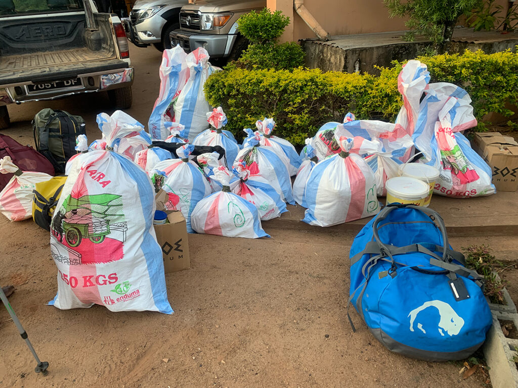 Schließlich biegen wir links ein auf die Wiese vor dem Park Office. Es sieht noch genauso aus wie vor sieben Jahren. Rund 50 Männer warten vor und neben dem Gebäude des Park Office. Mosesy wird von fasst jedem per Handschlag begrüßt. Und plötzlich scheint sein Gehstock kaum noch notwendig. So behände, wie man mit einseitiger Lähmung sein kann, bewegt er sich zu den Männern vor dem Office und beginnt direkt mit der Organisation und Delegation von Aufgaben. Gepäck wird abgeladen und auf der Wiese verteilt, aus einer Liste werden Träger und Kochhelfer ausgewählt. Endlich wird Mosesy „wieder gebraucht“ – er blüht richtig auf und genießt es, endlich wieder „seinen alten Job“ zu machen. Coco, unser zweiter Guide, stellt sich vor.