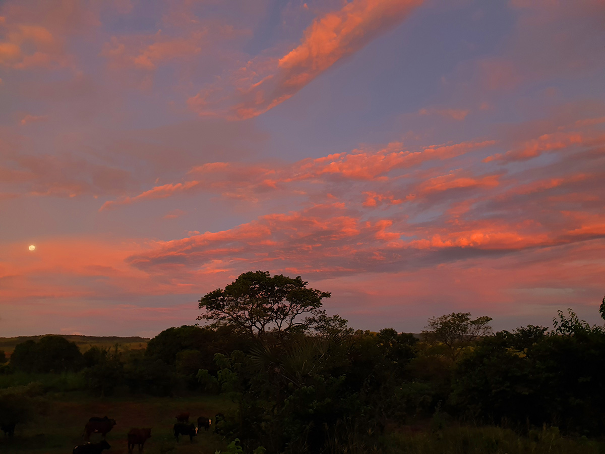 Als ich aufwache, entdecke ich als allererstes etliche Stechmücken im Moskitonetz. Nicht außendrauf. Innendrin. Mmh. Eigentlich waren da doch gar keine Löcher? Die Matratze gleicht einem kleinen Blutbad – in der Nacht wurden schon einige der Plagegeister erschlagen. Zum sperrangelweit offen stehenden Fenster scheint ein wunderschöner Sonnenaufgang herein. Ich öffne die Tür. Was zur Folge hat, dass die Stechmücken durch Schmeißfliegen ersetzt werden. Ich bin mir nicht sicher, ob das besser ist.