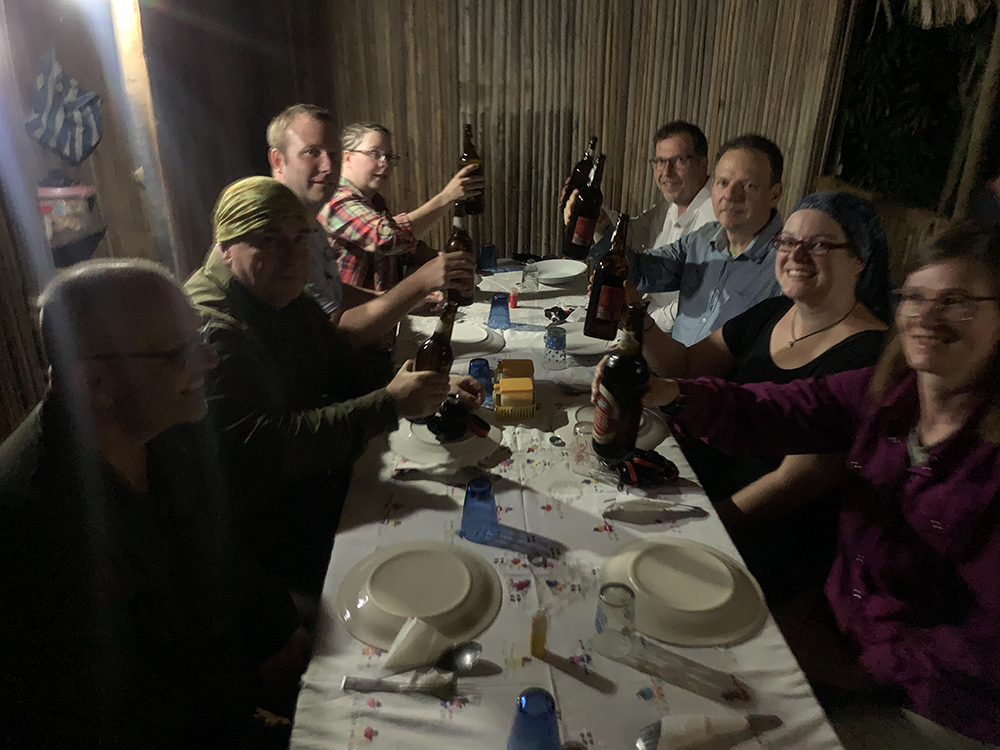 Jocelyn hat nicht nur geschockt reagiert, sondern sich auch gleich tatkräftig gekümmert. Als es dunkel ist, fahren wir ein Stück die Straße hinunter bis zu einer kleinen Hütte am Straßenrand irgendwo im Nirgendwo. Eine kleine Gargotte wird von einer einzigen Glühbirne erleuchtet. Im engen Inneren der Hütte ist ein langer Tisch aufgebaut, der sogar mit einer langen weißen Tischdecke gedeckt wurde. Wir neun Vazaha passen gerade so hinein. Die Jungs bauen sich auf der Außenseite – drinnen passt auch echt niemand mehr rein – provisorisch eine zweite Tischreihe auf. José hängt ein LED-Panel in die dustere Hütte, damit etwas mehr Licht vorhanden ist. Und dann gibt es ein echtes madagassisches Abendessen – für übrigens 5000 Ariary pro Person. Unmengen Reis und große Schüsseln mit „allem vom Huhn“. Dabei ist es hier üblich, dass man das Huhn einfach mit einem Beil zerhackt und dann im Topf kocht. Samt Knochen. Die geben Geschmack. Man muss also beim Essen ein bisschen aufpassen, die scharfkantigen Knochensplitter wieder auszusortieren. Auch Magen, Herz und andere Innereien sind inklusive. Das Gericht schmeckt prima, und draußen wie drinnen wird gut zugelangt. Das THB ist schön gekühlt, das Abendessen hat sich gelohnt. Auf eine erfolgreiche Reise und gute Freunde!