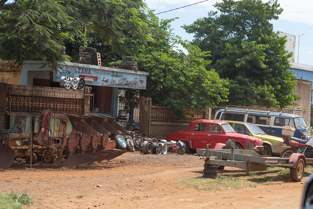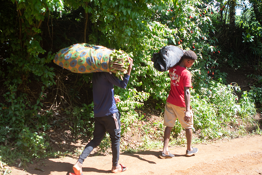 Gegen halb Zehn sind alle Landcruiser gepackt und alle Zeltplätze geräumt. Die Geländewägen setzen sich nacheinander in Bewegung. Der Weg ist rutschig, aber bergab besser befahrbar als andersherum. Ein paar einzelne Menschen kommen uns entgegen. Dann verlassen wir den Regenwald. Über den schmalen Pfad am Park Office vorbei geht es über eine Buckelpiste hinunter nach Joffreville. Und hier ist unglaublich viel los. Unmengen von Menschen sind auf der Straße, die ins Dorf führt. Unzählige Säcke Kat wandern den Berg herunter, die meisten zu Fuß. Im Dorf begegnen uns gleich zwei LKWs, deren Ladefläche mit Menschen – und Kat – überfüllt sind, es stehen sogar noch Leute auf der hinteren Stoßstange.