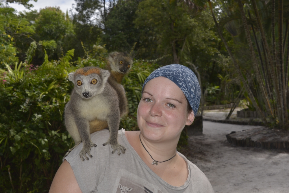 Als wäre das nicht genug, kommt zu der kleinen Ansammlung von Menschen und Tieren dann auch noch eine Gruppe Makis, darunter ein Kronenmaki-Weibchen mit einem kleinen Baby, das an ihrem Bauch hängt und sich nur selten auf den Rücken traut. Das kleine Ding mit seinen großen, neugierigen Augen und der kleinen Nase ist die Niedlichkeit in Person und sofort mein persönlicher Favorit der Gruppe. Zum Glück ist seine Mama ein absoluter Obstjunkie, und springt sogar mit Nachwuchs auf die ein oder andere Schulter herum, um an Rambutan zu kommen. Der Papa des Kleinen, ein schwarzes Mohrenmaki-Männchen, ist auch in der Nähe, traut sich aber nur auf wenige Meter heran und beobachtet uns lieber mit Sicherheitsabstand. Solange Menschen in der Nähe sind, fühlen sich die Makis anscheinend sicher vor Schlangen und Co, und so steigt plötzlich das Makibaby vom sicheren Bauch seiner Mama und wagt die ersten Schritte allein auf einer riesgen Ravenala. Als die Makibande dann jedoch weiterzieht, sitzt der kleine Kerl jämmerlich quiekend immernoch auf der großen Pflanze, und weiß einfach nicht, wie er weiterkommt. Nach unten will das Baby nicht, und springen kann es noch nicht weit genug. Der Versuch, sich vorsichtig an einer Blattspitze entlang zum nächsten Baum zu hangeln, misslingt und endet fast mit einem Absturz. Also sitzt es und fiept, bis nach gut einer Viertelstunde doch noch seine Mama kommt und ihr Baby wieder mitnimmt. Sonja kämpft währenddessen mit den frechen Makijungs, die ihr auf die Schulter gesprungen sind und ihr den Hintern ins Gesicht halten. „Boah, hoffentlich pinkelt der jetzt nicht!“ -spricht’s und im gleichen Moment wird es feucht auf Sonjas T-Shirt.
