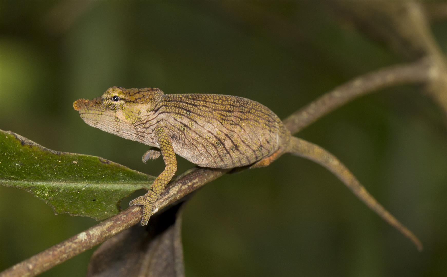 Später trifft man sich zum Abendessen wieder im Feon’ny Ala. Da es noch recht früh ist, laufen Tanala und ich im Dunkeln noch einmal die Straße entlang. Leider ist es sehr trocken und dadurch nicht gerade Froschwetter. Oft hüpfen die Tierchen einem hier über die Füße, wenn man entlang der Straße in Richtung Andasibe läuft. Heute leider nicht. Nichtsdestotrotz finden wir ein Calumma nasutum, das müde auf einem Blatt sitzt, und ein paar winzige Frösche, deren Art sich nicht so genau bestimmen lässt. Es sind wohl noch Jungtiere, und einige Arten haben als solches eine komplett andere Färbung als ausgewachsen. Im Gebüsch finden sich eine Menge Stabschrecken, mit und ohne bunt gefärbte Beine. Irgendwann verschlägt uns der Weg wieder zurück zu den Bungalows, vielleicht sind wir in den nächsten Tagen erfolgreicher.