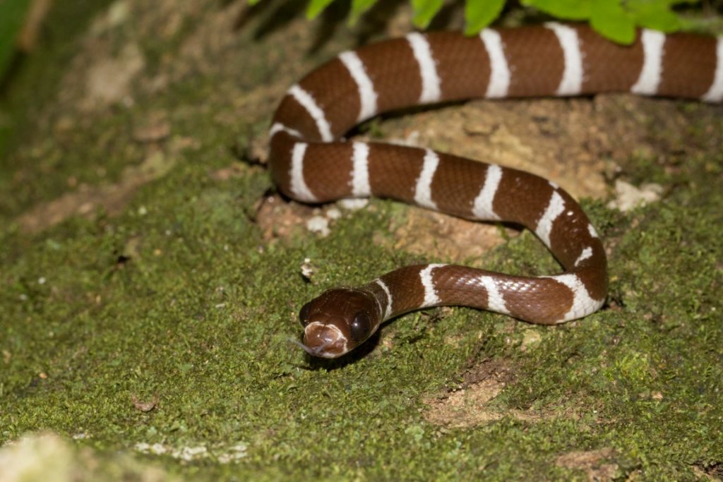 Der Vormittag steht wieder im Zeichen der Fotografie. Mosesy hat eine Parastenophis betsileanus gefunden, eine braun-weiß gestreifte Trugnatter. Die schmale Schlange ist enorm schnell und windet sich Äste hoch und wieder herunter. Es erweist sich als extrem schwierig, ein gutes Foto des Tierchens zu bekommen. Martin wird bei einem Selfie mit der Streifenschlange „fast gefressen“ – naja, vielleicht nicht ganz.